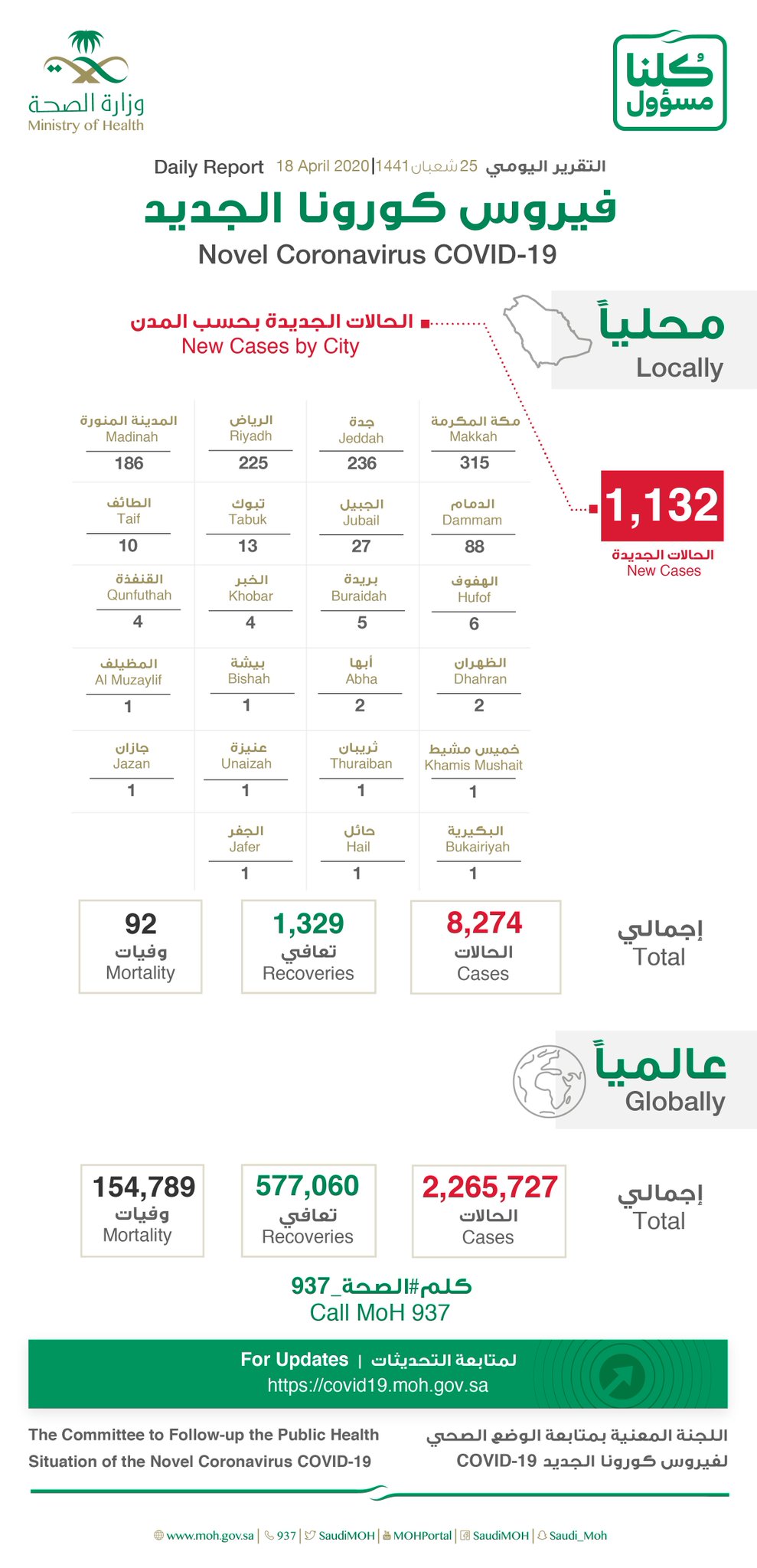 متحدث وزارة_الصحة: سجلنا في المملكة 1132 حالة جديدة مؤكدة، توزعت في مختلف المدن. |