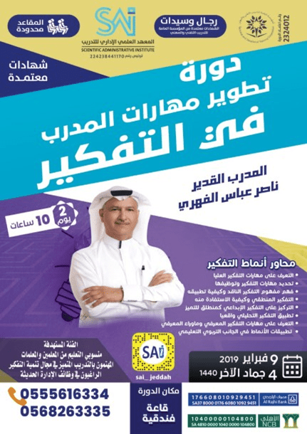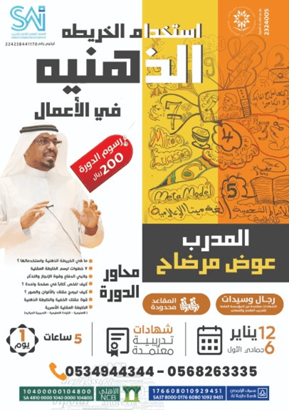 اقوى وافضل الدورات بأرخص الأسعار شهادات معتمدة من مقام المؤسسة العامة للتدريب التقني والمهني سنستقبل سنةً جديدة تحمل معها أملاً جديداً بمستقبلٍ يملؤه النجاح والتقدم المعهد العلمي الإداري للتدريب يقدم لكم اقوى الدورات التطويرية – اجعل العام الجديد بداية لتطورك العلمي والعملي اهم دورات تطويرية بمدينة جدة *يتم تحديث الصفحة بصورة مستمرة* برجاء الضغط على صورة الدورة او اسم الدورة لحجز مقعدك: تم ترتيب الدورات من التاريخ الأقرب للأبعد دورة استخدام الخريطة الذهنية في الأعمال خلال هذه الدورة سنستعرض إحدى أهم وأقوى وسائل التخطيط التي يمكن للإنسان أن يستخدمها التاريخ: السبت 12 يناير 6 جمادى الاولى من الساعة 5 مساءاً الى 10 مساءاً (مقاعد مخصصة للرجال والنساء) https://i.suar.me/qWWwV/l دورة خدمة العملاء تعتبر خدمة العملاء أهم ركن من أركان الشركة , حيث يجب اختيار موظفي خدمة العملاء بدقة واحترافية لأنهم يمثلون الصورة الذهنية للشركة لدى العميل التاريخ: السبت 19 يناير 13 جمادى الاولى من الساعة 5 مساءاً الى 10 مساءاً (مقاعد مخصصة للرجال والنساء) https://i.suar.me/NZZA4/l دورة التميز في إدارة العلاقات العامة لايوجد أفضل من نصيحة ستيف جوبز، فقد قال عن العلاقات العامة: “ إذا كان لدي دولار زائد، لكنت صرفته علي العلاقات العامة “ التاريخ: السبت 26 يناير الموافق 20 جمادى الأولى من الساعة 5 مساءاً الى 10 مساءاً (مقاعد مخصصة للرجال والنساء) https://i.suar.me/dqqQl/l دورة تطوير مهارات المدرب في التفكير – مدينة جـدة دورة إبداعية مخفضة! https://i.suar.me/8EEnn/l للاستفسارات اتصال او واتساب: 0535357357 جميع الدورات المعلن عنها حاليا بمدينة جــدة قاعة فندقية |