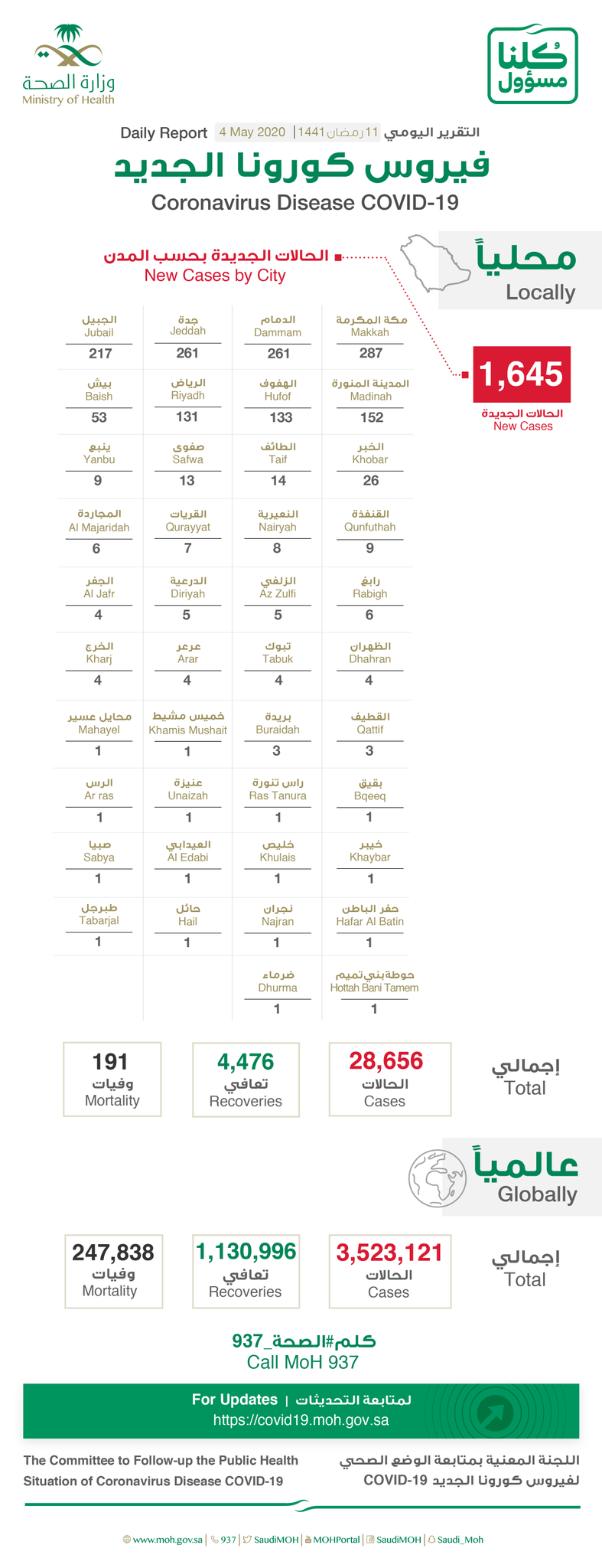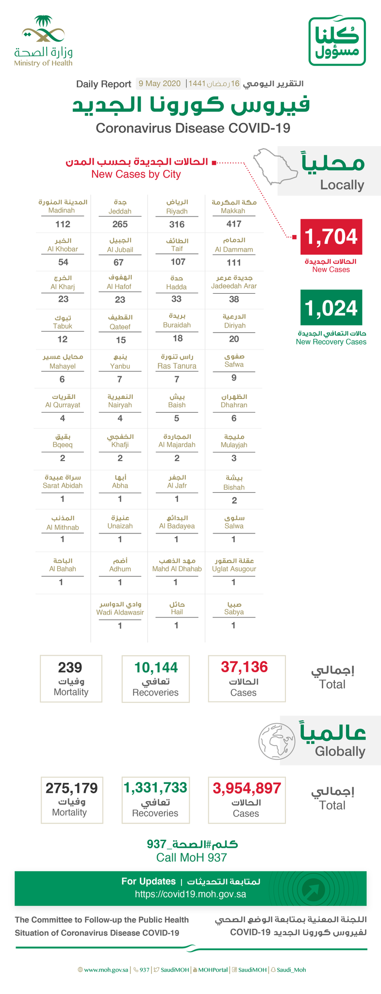 الصحة تعلن عن تسجيل (1966) حالة إصابة جديدة بفيروس #كورونا الجديد (كوفيد19)، وتسجيل (9) حالات وفيات رحمهم الله، وتسجيل (1280) حالة تعافي ليصبح إجمالي عدد الحالات المتعافية (12,737) حالة ولله الحمد.