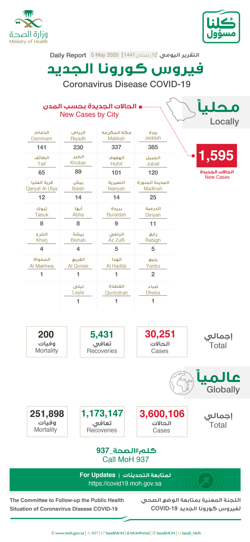 الصحة تعلن عن تسجيل (1595) حالة إصابة جديدة بفيروس #كورونا الجديد (كوفيد19)، وتسجيل (9) حالات وفيات رحمهم الله، وتسجيل (955) حالة تعافي ليصبح إجمالي عدد الحالات المتعافية (5431) حالة ولله الحمد.