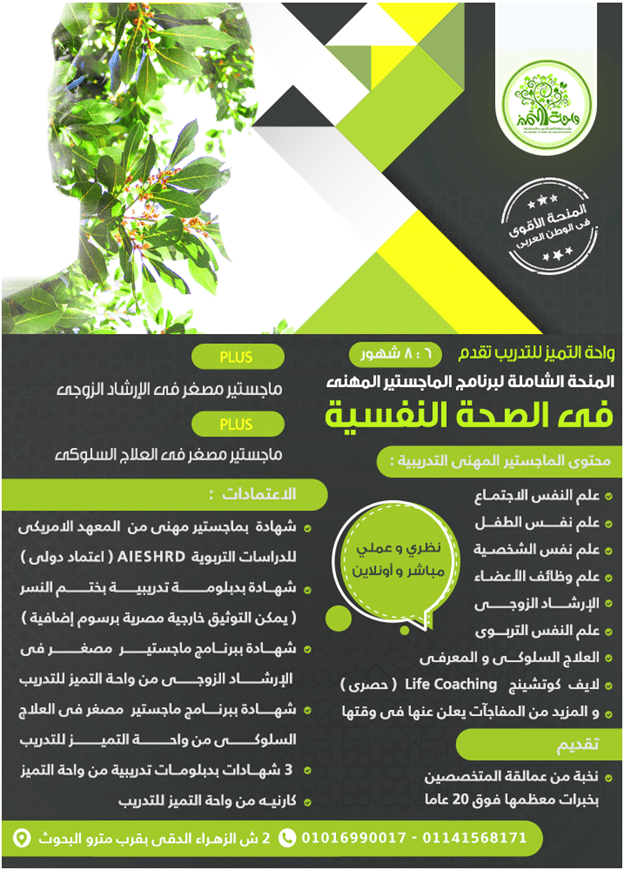 الصحة النفسية و التربية الخاصة و التخاطب و التنمية البشرية واحة التميز الماجستير المهنى فى الصحة النفسية المنحة الشاملة الأقوى فى مصر والوطن العربى من واحة التميز للتدريب مباشر و أونلاين على مدى 6 إلى 8 شهور يوم واحد أسبوعيا .. . بالإضافة إلى عدد 2 ماجستير مصغر فى الإرشاد الزواجى & العلاج السلوكى و المعرفى عايز أقوى منحة شاملة بمسمى برنامج ماجستير مهنى فى الصحة النفسية ؟ مباشر و أونلاين ؟ تدريب بعمق و تخصص ؟ أقوى المتخصصين فى مصر و الوطن العربي ؟ خصم ضخم لفترة الاشتراك بيتم سداد الاشتراك كاملا أو سداد النصف أو الثلث و الباقي على شهرين للمصريين مباشر 3999 ج و أونلاين 4999 ج و للإخوة العرب 1899 ريال أو 499 $ البداية السبت 22 - 6 - 2019 م من 3.15 إلى 7 م نخبة من أقوي المتخصصين في مجال الصحة النفسية و الإرشاد الزواجي لسهولة التواصل معكم برجاء ملء استمارة الحجز الأولى التالية بدقة http://bitly.ws/46V9 لمزيد من التفاصيل من خلال بلوجر http://bitly.ws/46Vo قناتنا على اليوتيوب و بعض آراء المتدربين http://bitly.ws/46Vt الموقع الالكترونى http://wahaacademy.org/ للتواصل معنا : 00201141568171 - 00201016990017 متوفر واتساب و فايبر و ايمو العنوان : 2 شارع الزهراء الدقى بالقرب من مترو البحوث - الجيزة https://i.suar.me/4LqBA/l يمكنكم أيضا الاشتراك فى المنح التالية فى التنمية البشرية و التربية الخاصة الماجستير المهنى فى التنميـــة البشرية أقوى منحة شاملة للماجستير مهنى تدريبى مدعمة فى التنميــة البشــرية كما و كيفا ... مباشر و أونلاين - بعمق و تخصص .. على مدى 4 شهور ... يعنى هيفرق معاك شخصيا و عمليا و مستقبليا ... البداية 12 يوليو 2019 م الجمعة و السبت أسبوعيا من 3 إلى 6.30 م و متاحة للمؤهلات العليا بمسمى ماجستير مهنى ... و بتضم نخبة من العمالقة و المتميزين جدا أصحاب الخبرات ... مثل : د شــريف أبــو فــــرحــة ... الخبير الدولى فى التنمية البشرية و غيره الكثير و عرض خااااص جداااا لفترة محدودة للحجز قبل 20 - 6 - 2019 أو حتى اكتمال العدد .. مع إمكانية السداد على دفعتين على أن يكون النصف أو الثلث مقدما مباشـــر للمصريين 2850 ج و أونلاين 3750 ج بدلا من 6000 ج للإخوة العرب 1330 ريال أو350 دولار بدلا من2800 ريال أو750 $ بعد انتهاء فترة الخصم بيتم رفع قيمة الاشتراك للقيمة الحقيقية له الاشتراك يشمل التدريب و المواد العلمية PDF و الاعتمادات الموضحة و لا يشمل توثيق خارجية أو شحن الشهادات https://i.suar.me/0l2Vv/l الماجستير المهنى التدريبي لا غنى عنه : لكل معلم أو تربوي أو كادر تدريس حتى المستوى الجامعي و الأخصائيين النفسيين و الاجتماعيين والمرشد الأسري و التربوي و العاملين على العمل الاجتماعي و الخيري والعمل العام و معلمات رياض أطفال و الأئمة و الدعاة و الراغبين فى تطوير الذات بقوة تفرق معهم في مستقبلهم و تواصلهم على مختلف المستويات و العاملين في مجال العلاقات العامة والإعلام و الذين يتطلب عملهم الاحتكاك بالجمهور بصورة مستمرة مـلاحظـة هـامة : برامج الماجستير و الدكتوراة لدينا برامج تدريبية بهدف التنمية المهنية و التطوير المهنى وتفتح فرص عمل و آفاق أفضل و أوسع للحاصلين عليها و ليست درجات علمية (وليست لها علاقة بجامعات حكومية ) أقوى منحة شاملة فى التربية الخاصة الدبلوم التدريبى الشامل 3 : 4 شهور يومان أسبوعيا البداية الجمعة 21 - 6-2019 و يمكن التكملة للماجستير المهنى 6 : 8 شهور مكثفة انضم لأقوى منحـــــة شاملـــة في إعــــداد أخصائـــى التــــربية الخـــــاصة فى مصر و الوطن العربي من واحة التميز .... .تدريب خارج المنافسة ... عملـــــى و نظــــــرى - مبــــــاشر و أونـــــــلاين ... من 3 : 4 شهور الجمعة و السبت من 10 : 2.30 م نخبــة من عمالقة المتخصصين في بخبرات معظمها تتعدى 20 عـــامــــا من التخصص انضم للمنحة الأصليــــــة.... اللى خرجت أقوى دفعات أخصائيين على مستوى الوطن العربى من واحـــــــة التمـــــــيز .. الاستثمــــــار : للمصريين للمباشر 3400 ج و أونلاين 3950 ج بدلا من 6000 ج و للإخوة العرب 1499 ريال بدلا من 2800 ريال غير شاملة الشحن أو أى ت