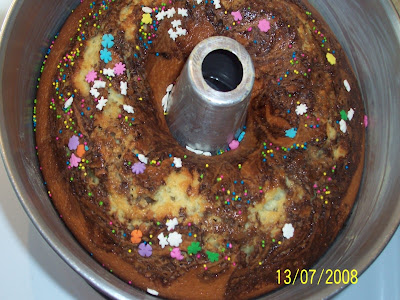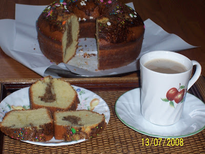 2 كوب طحين جميع الاستعمالات + ملعقتين كبار طحين ملعقة كبيرة بيكنج باودر نخلطهن معا في اناء ![]() ![]() نضع في الخلاط: 4 بيضات فانيلا نصف كوب حليب نصف كوب عصير برتقال كوب ونصف سكر واذا حبيتيها حلوة اكثر حطي كوبين بس طلعت بالكوب والنصف ممتازة نصف كوب زيت تخلط معا حتى تتجانس ثم تصب فوق خليط الطحين وتحرك جيدا ![]() نأخذ مقدار صحن صغير من الخليط ونضع عليه شوكولاته سرب الكمية حسب مابدك ![]() والخليط الباقي نضعه في قالب مدهون بطحينية أو زبدة ![]() ونضع فوقه خليط الشوكولاته وأنا مسكت علبة الشوكولاته وعملت خطوط فوق الخليط وعملته بالشوكةطبعا أنا شغلت الفرن قبل ما أعمل الكيكة على درجة حرارة 350 فهرنهايت ![]() ![]() خبز الكيكة مدة ساعة بالنسبة للفرن اللي عندي طبعا بعد نصف ساعة من خبزها طلعتها ورشيت عليها حبيبات السكر للزينة وبعدين رجعتها للفرن ![]() ![]() ليت عند الباب نهرا من العسل والسماء تمطر سحايسها ذهب والفرح ثوبا عسى مابه طسل والنسايم هبهبتها هب هبوالمزون اللي بحمله قد رسل ورنة المطر شبيهات الشهب |
